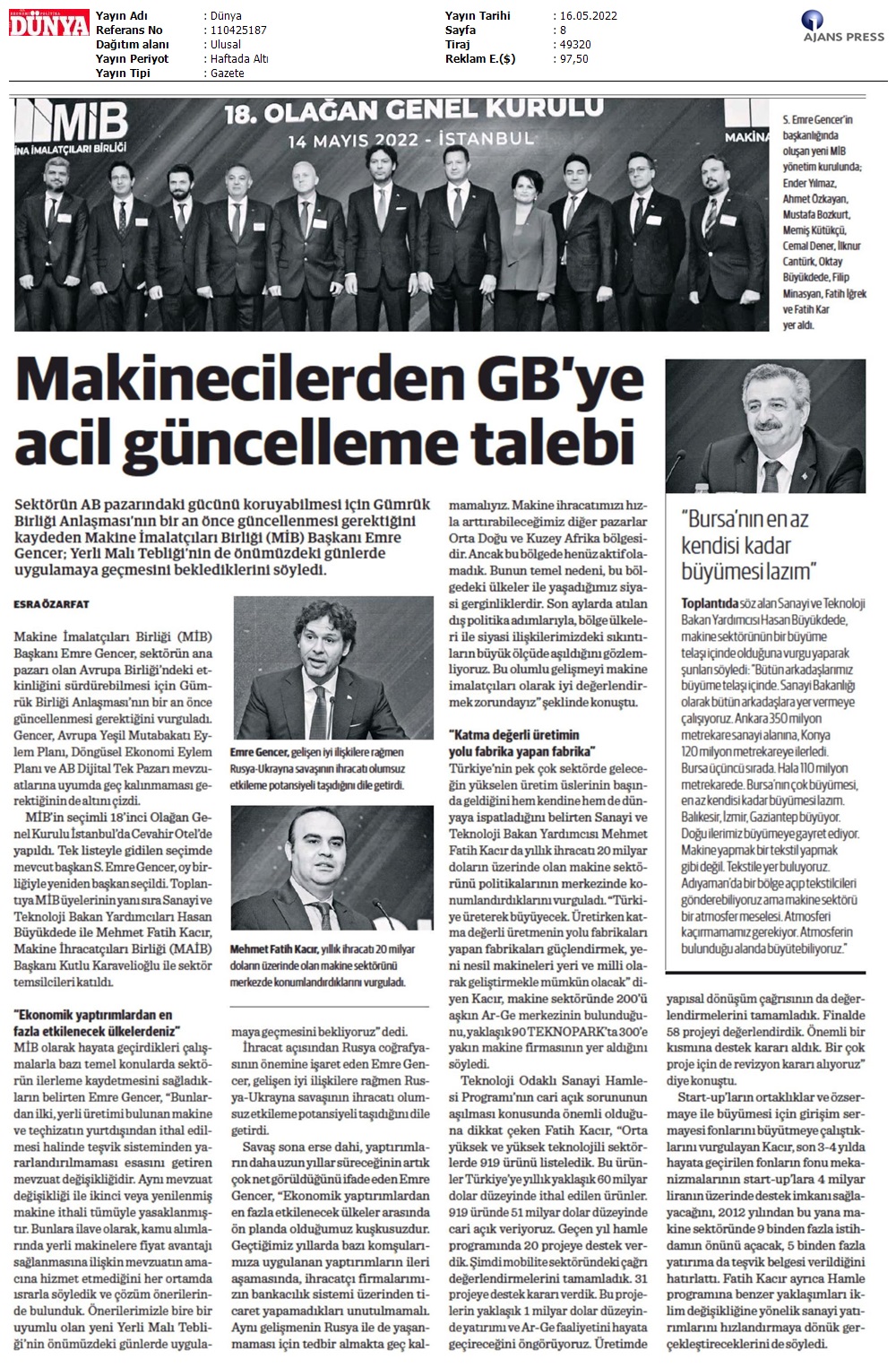 Gencer: “Zor bir dönemde çalışmalarımıza çok değerli katkılar sunan, bu dönemde nöbeti devreden Mustafa EROL ve Burç ANGAN arkadaşlarımıza teşekkür ediyoruz. Makine sanayinin bugünlere gelmesinde büyük hizmetleri geçmiş olan, HİDROMEK’in kurucusu rahmetli Hasan Basri Bozkurt’u, Durmazlar Makine’nin kurucusu rahmetli Ali Durmaz’ı ve Baykal Makine’nin kurucusu rahmetli Hakkı Baykal’ı, MİB’in kurucusu rahmetli Arslan Bekir Sanır, Sektörümüze büyük hizmetleri geçmiş olan rahmetli Cenap Eke ve son dönemde hakkın rahmetine kavuşan üyelerimiz İdris Yamantürk (Parsan), Yusuf Tekin (Cematek), Kerim Selek (Genç Değirmen), Mehmet Arslan ve Volkan Arslan’ı (Hidrolift) ve aramızdan ayrılan tüm büyüklerimizi saygı, minnet ve rahmetle anıyoruz. Makine sanayimizin, atölyelerden modern üretim tesislerine uzanan yolculuğunda, özveri ve gayretle çalışarak bugünkü konumuna taşıyan; DURMAZLAR Makine’nin kurucusu Sayın Hüseyin Durmaz’a, SİMGE Grubu kurucusu Sayın Nezir Gencer’e ve geçmişteki bütün öncülerimize saygı ve şükranlarımızı iletiyoruz.