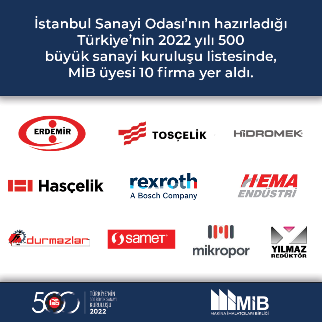İstanbul Sanayi Odası tarafından her yıl paylaşılan listede, 2022 yılı en büyük 500 sanayi kuruluşu içerisinde 10 MİB üyesi firmamız kendisine yer buldu. Listelerde yer alan firmalarımızı tebrik ediyor, önümüzdeki yıllarda daha çok firmamızın ilgili listelerde yer almasını umuyoruz.